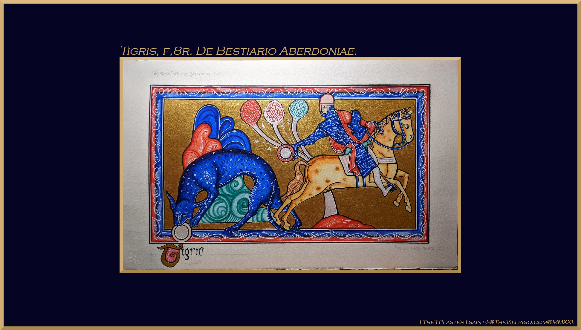 The Aberdeen Bestiary is one of my favourite manuscripts. The knight portrayed on the page, who is stealing a tiger cub, has thrown a mirror at the tigress to stop her pursuit of him. for once she catches sight of the mirror she becomes transfixed by her own reflection.